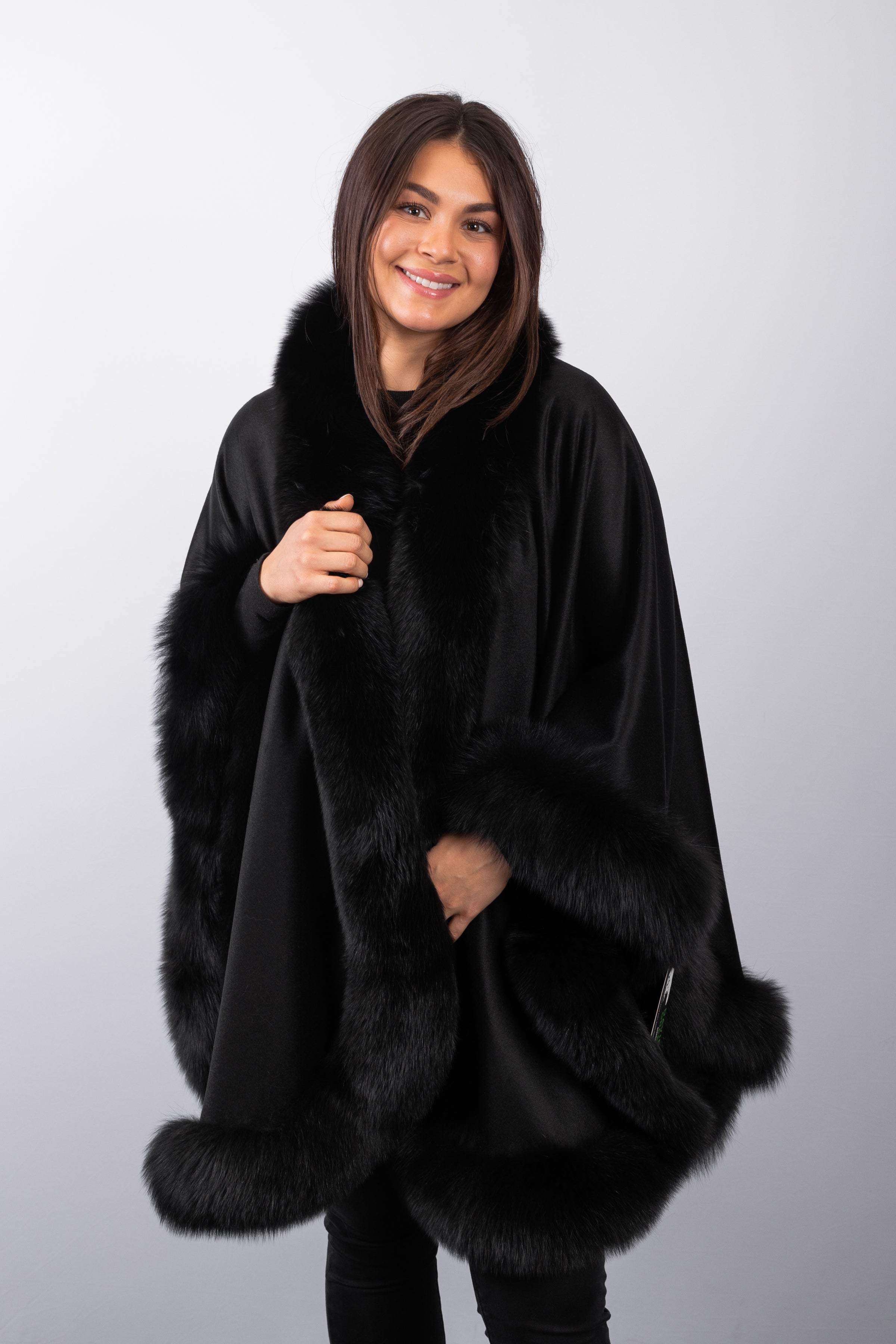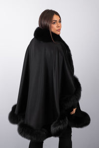 Black Cashmere Cape with Black Fox Fur Trim - Long