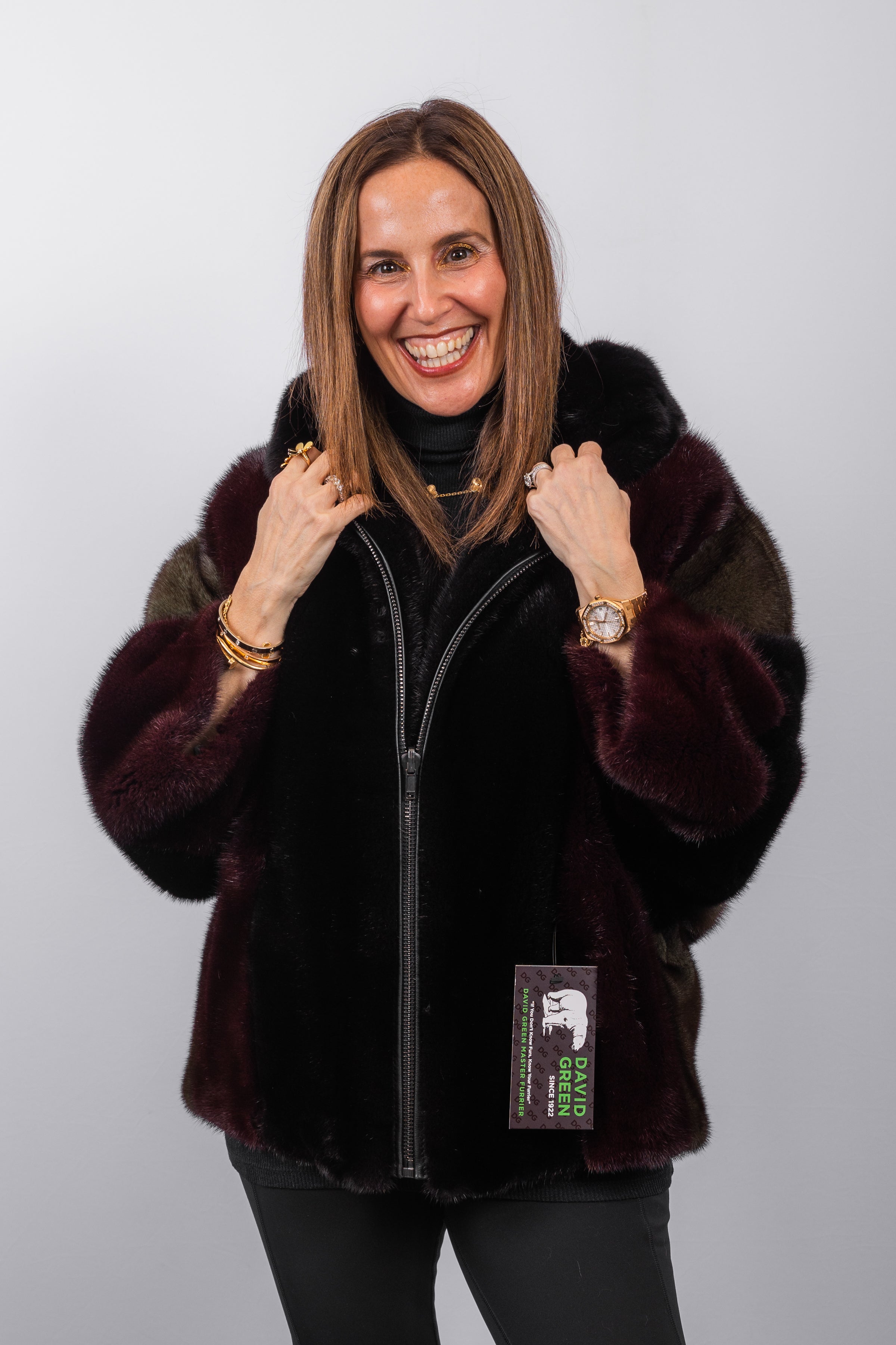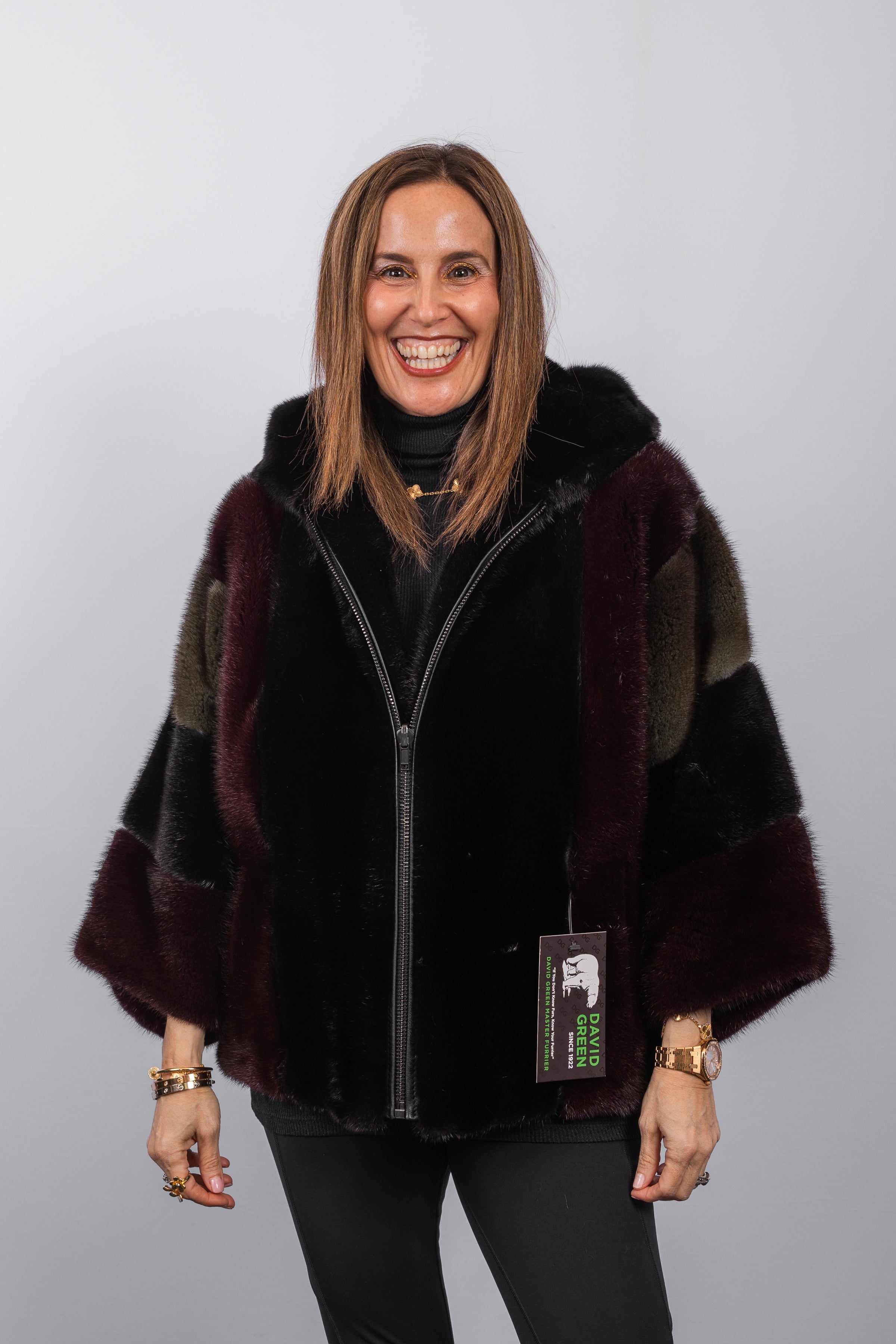 Sophisticated and effortlessly cool, this mink jacket combines classic luxury with an artful edge. Rich shades of black, merlot, and olive create depth and visual interest, while the luxurious mink offers softness and warmth. Designed with bracelet-length sleeves, a double fur–lined hood, and a zipper front, this jacket balances refined craftsmanship with contemporary functionality.
