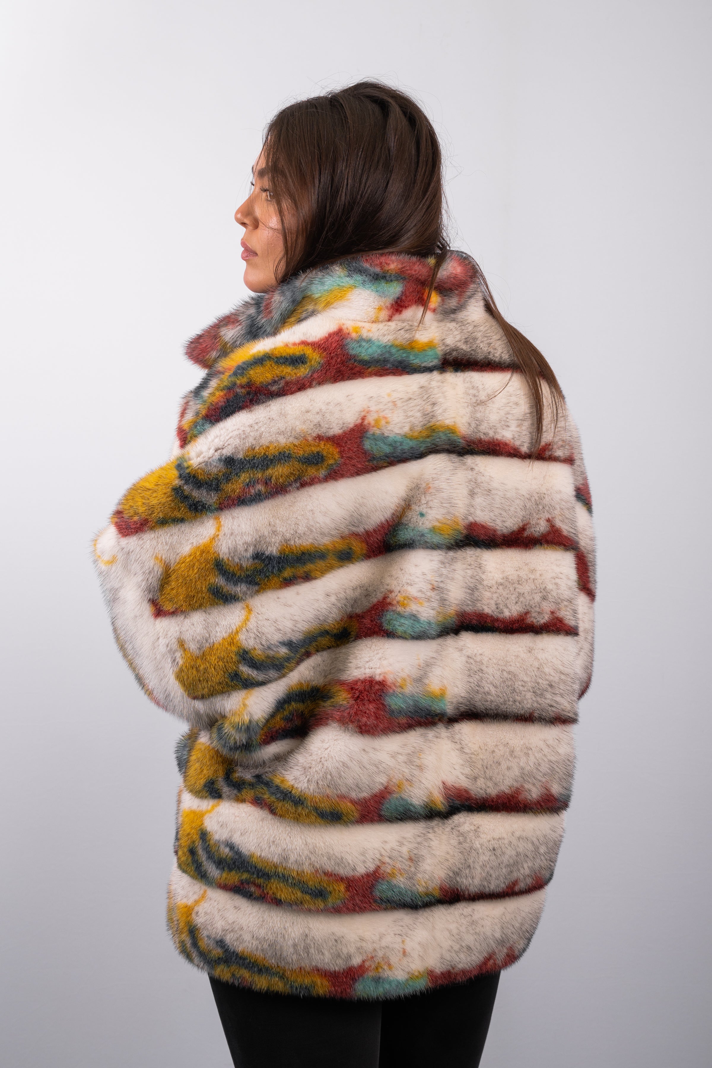 Bold yet refined, this cross mink jacket is designed to make a sophisticated statement. Crafted from luxurious cross mink, it features eye-catching multicolor accenting that adds depth and modern flair to the design. The chic 3/4-length sleeves create a flattering, contemporary silhouette, while keska closures provide a seamless, polished finish. Lightweight yet naturally warm, this jacket is perfect for elevating both day and evening looks.