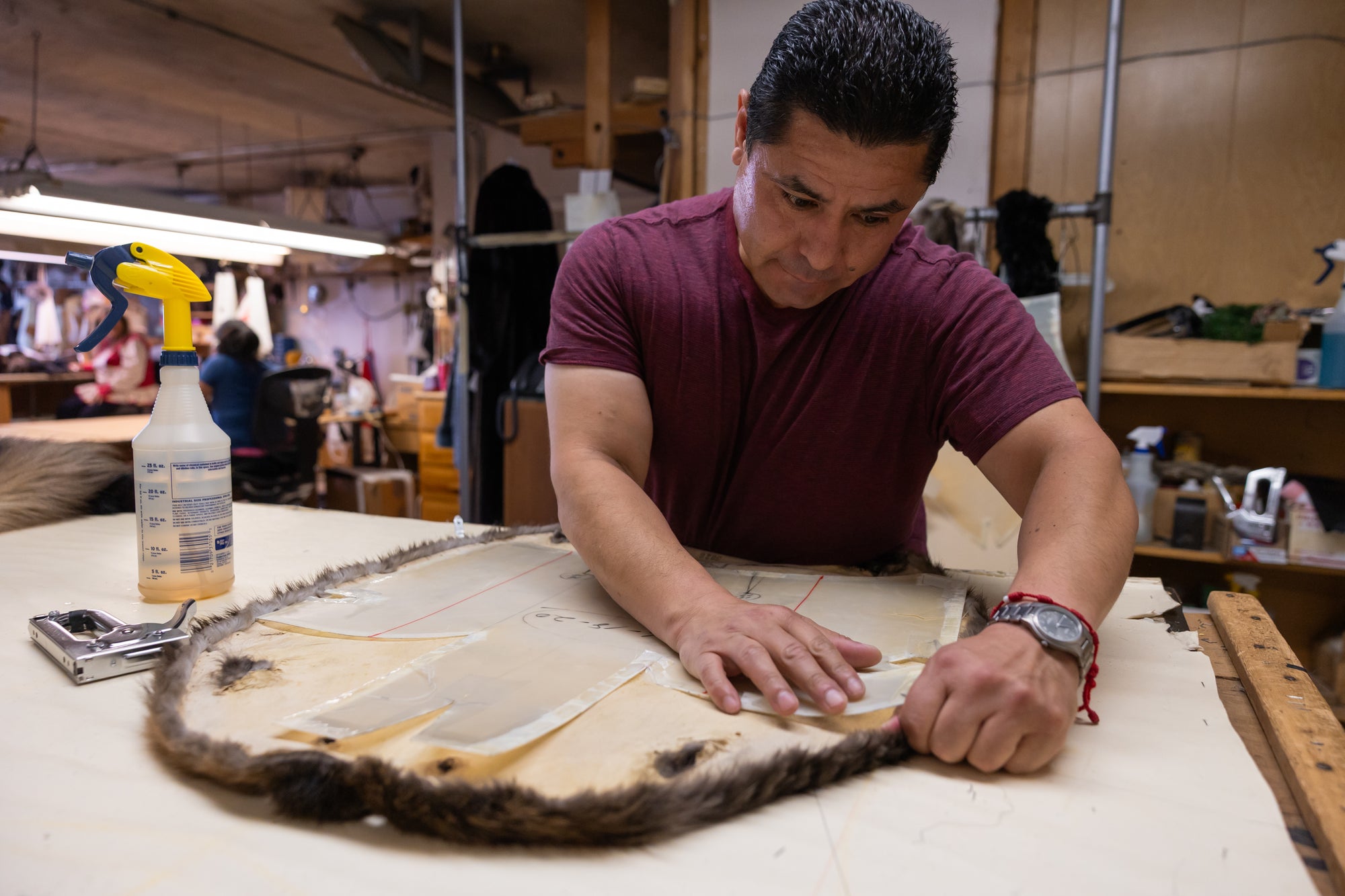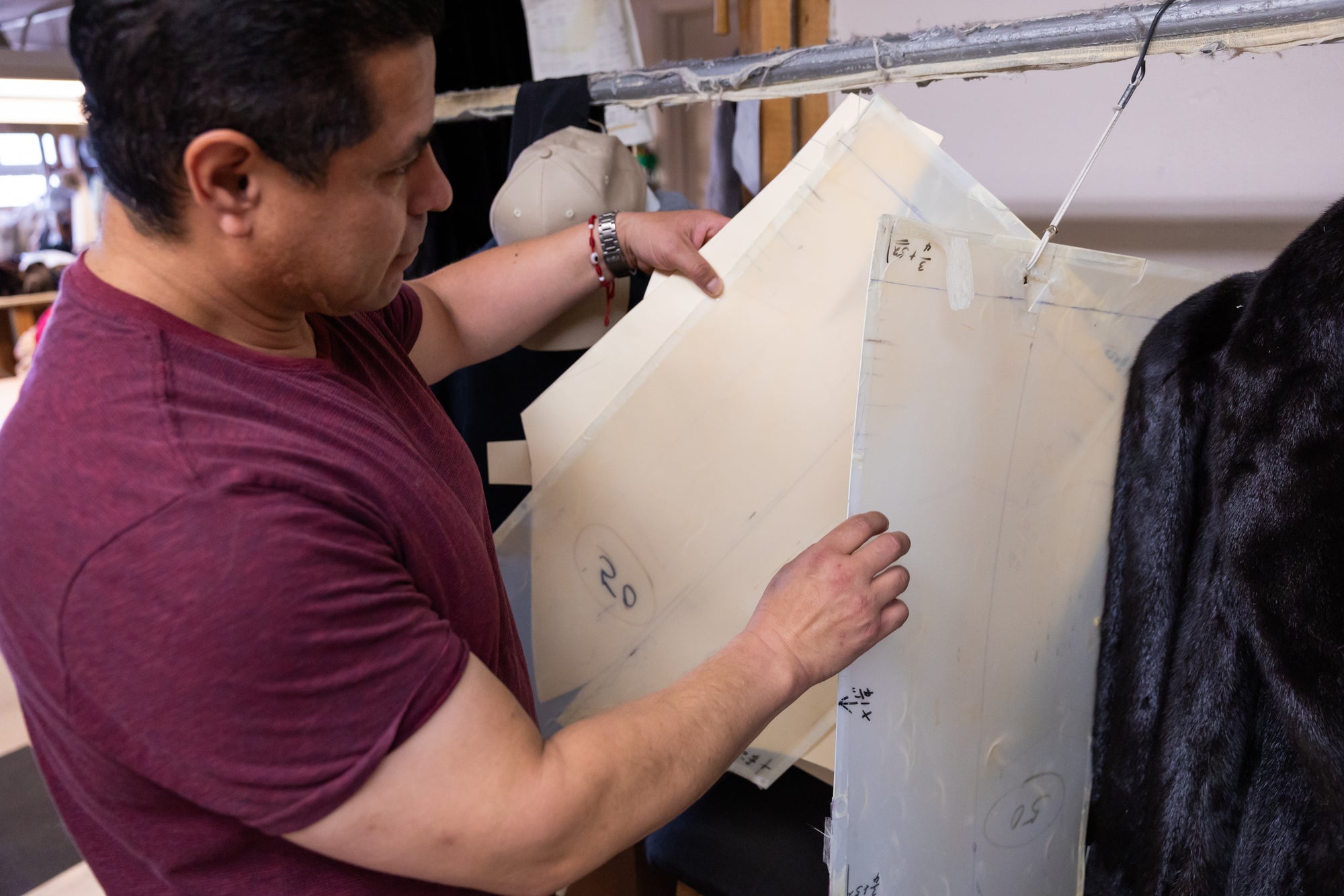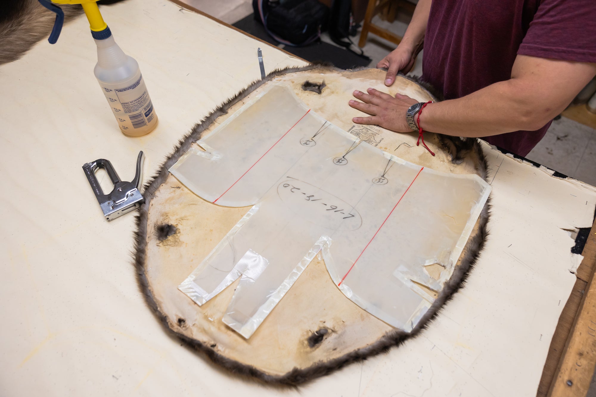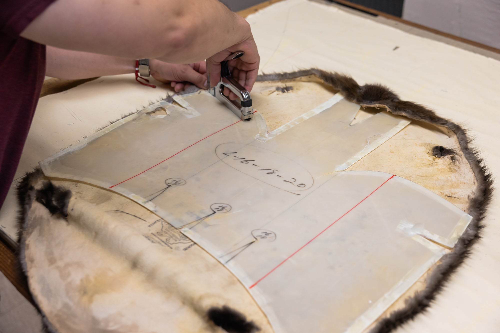 The garment pattern is carefully transferred onto the stretched skins. Accurate pattern placement is essential for symmetry, proper fit, and efficient use of the fur.