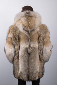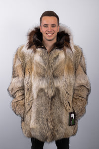 The jacket features a double zipper for effortless, functional closure and a toggle around the hood for adjustable fit. Expertly matched skins and the natural tonal variations of the coyote create a seamless, harmonious appearance, highlighting the beauty of the fur while maintaining a refined, cohesive silhouette.