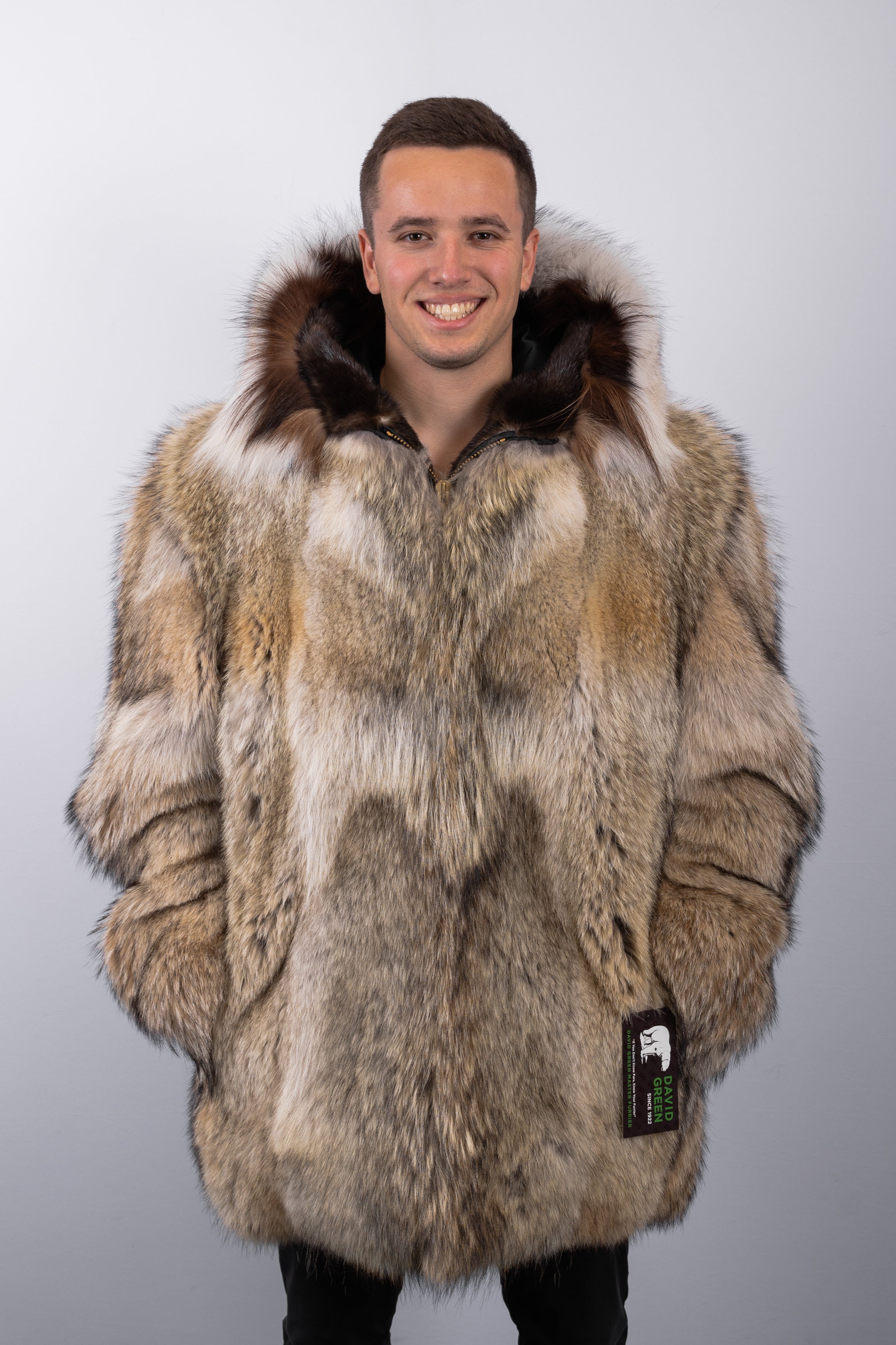 Since 1922, David Green Master Furrier has been defining the pinnacle of Alaskan outerwear with its signature parka—a true masterpiece of warmth, artistry, and heritage. Crafted from sumptuous natural coyote, this parka is soft to the touch yet remarkably durable. The hood is framed by a timberwolf ruff reinforced with a wolverine and otter interface, designed to flip out and shield against the harshest winds while adding architectural elegance to the silhouette.