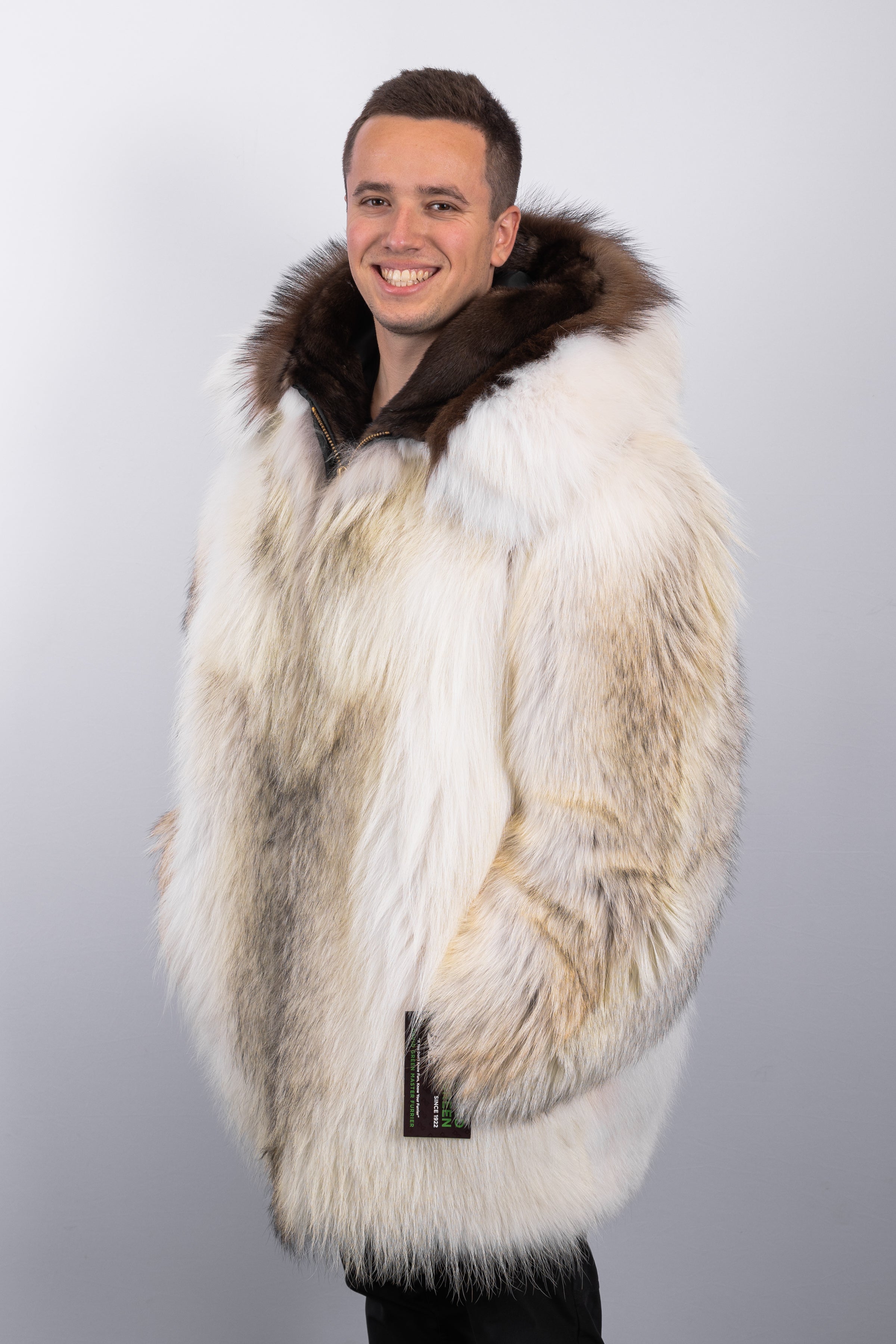 Since 1922, David Green Master Furrier has been defining the pinnacle of Alaskan outerwear with its signature parka—a true masterpiece of warmth, artistry, and heritage. Crafted from sumptuous natural timberwolf, this parka is soft to the touch yet remarkably durable. The hood is framed by a timberwolf ruff reinforced with a wolverine and otter interface, designed to flip out and shield against the harshest winds while adding architectural elegance to the silhouette.