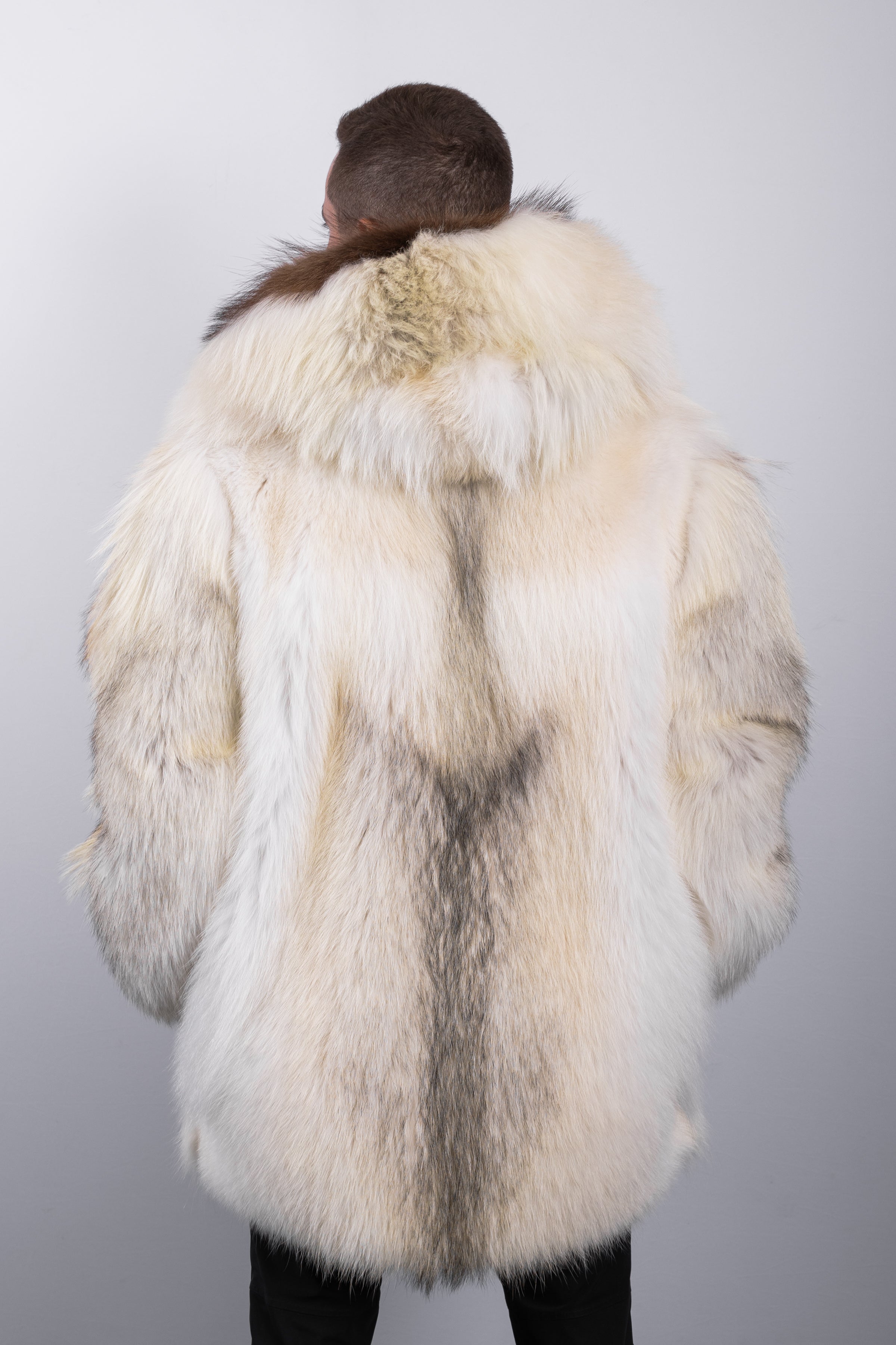 The jacket features a double zipper for effortless, functional closure and a toggle around the hood for adjustable fit. Expertly matched skins and the natural tonal variations of the timberwolf create a seamless, harmonious appearance, highlighting the beauty of the fur while maintaining a refined, cohesive silhouette.